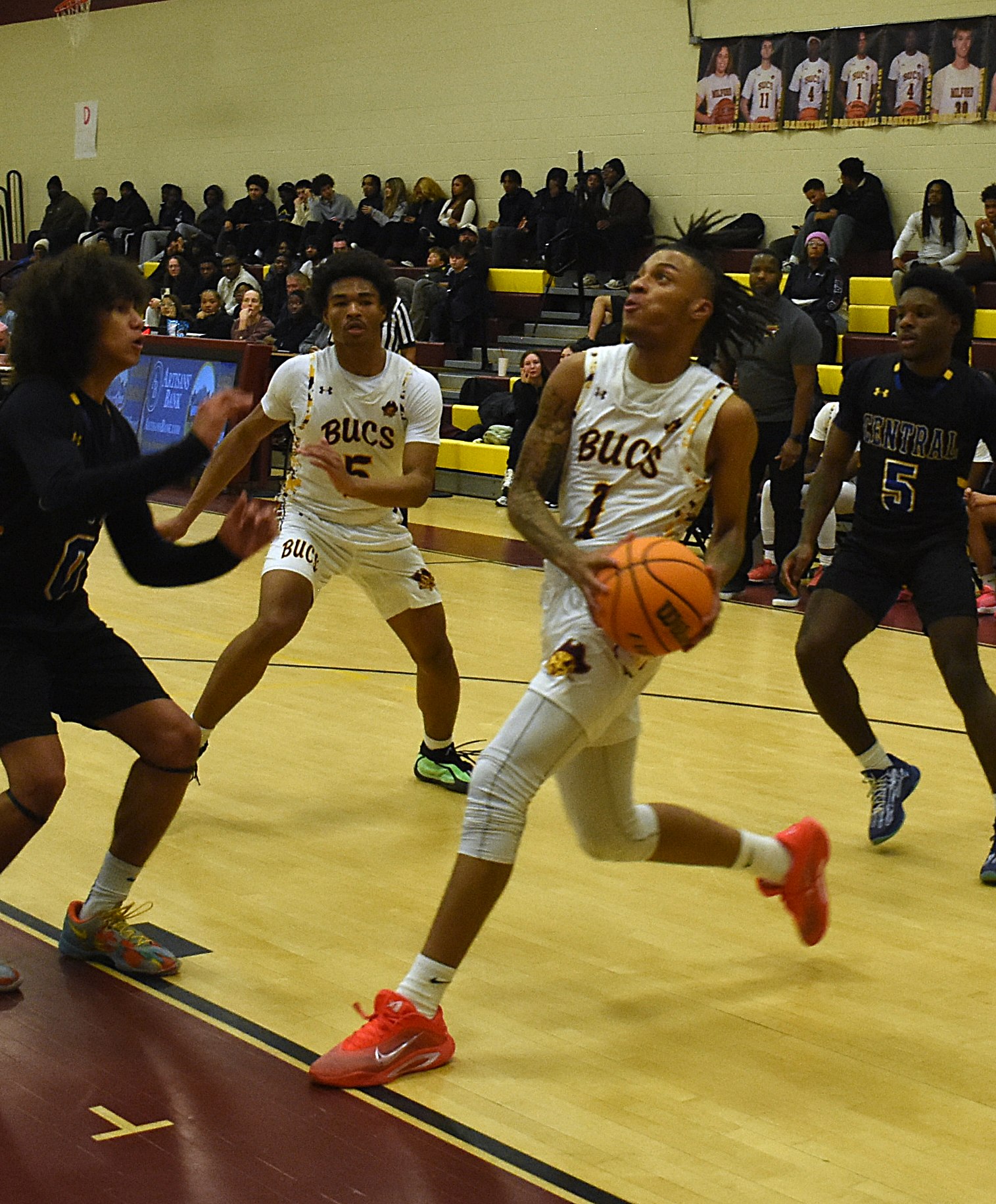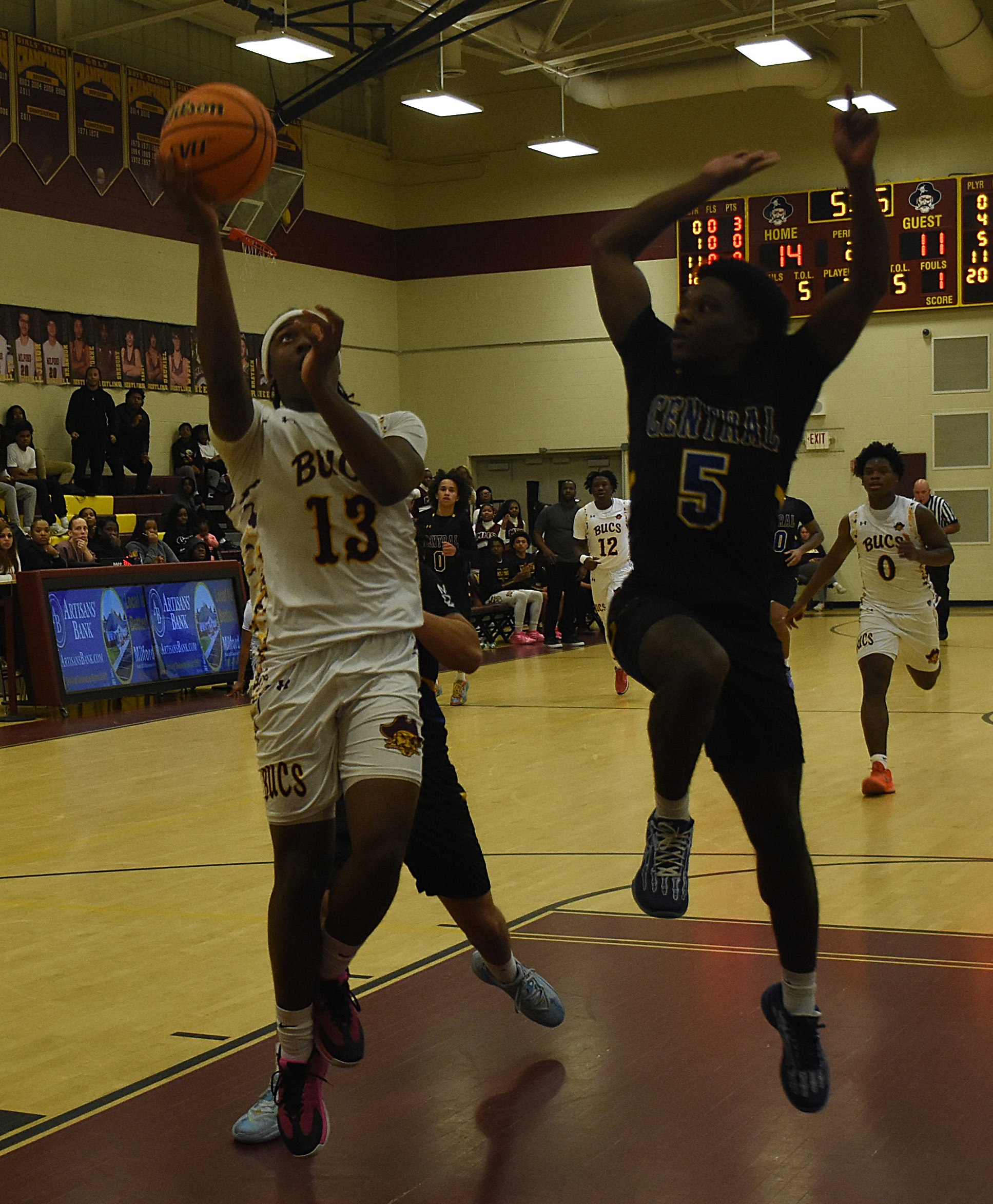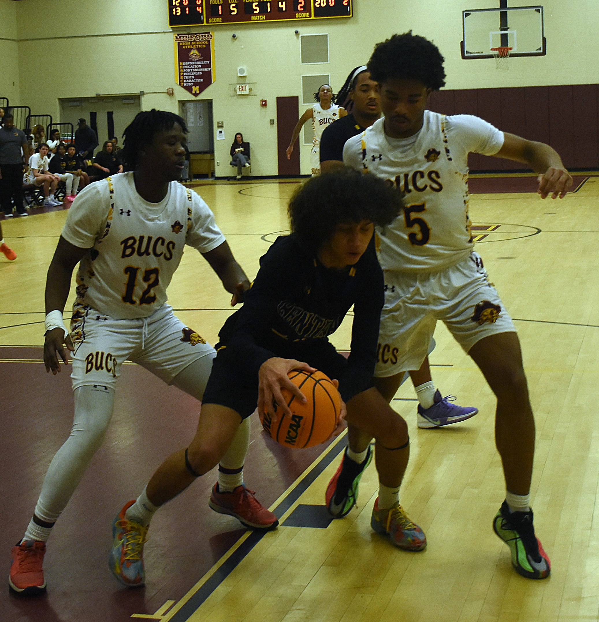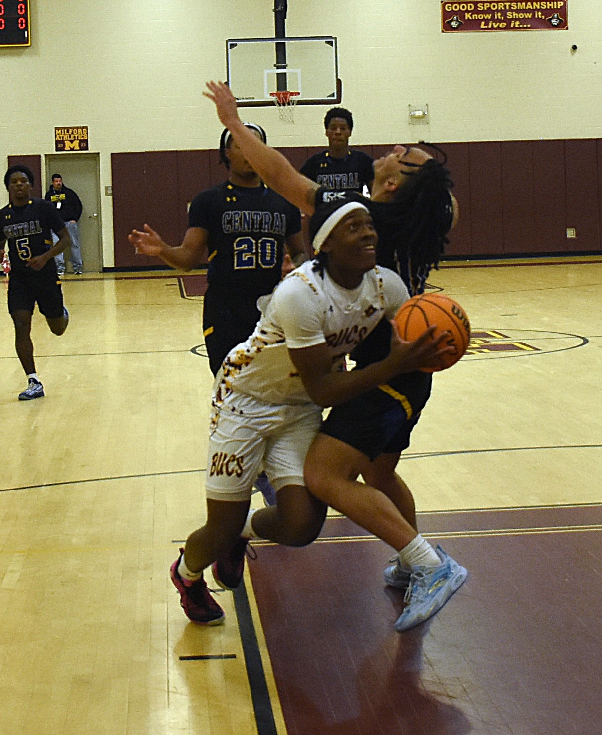 Milford slowly but surely began to take control. One of the key players for Milford was junior Karon Bacon who did it all on both ends of the court. His seven points, nine rebounds and eight assists only tell half the story. His work defensively was spectacular as he constantly cut off passing lanes and drew offensive fouls to keep Central from gaining traction.