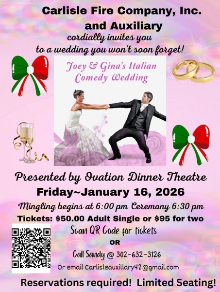 Carlisle Fire Company will present a dinner theatre on Friday, January 16, 2026. They cordially invite you to “Joey and Gina’s Italian Comedy Wedding.”