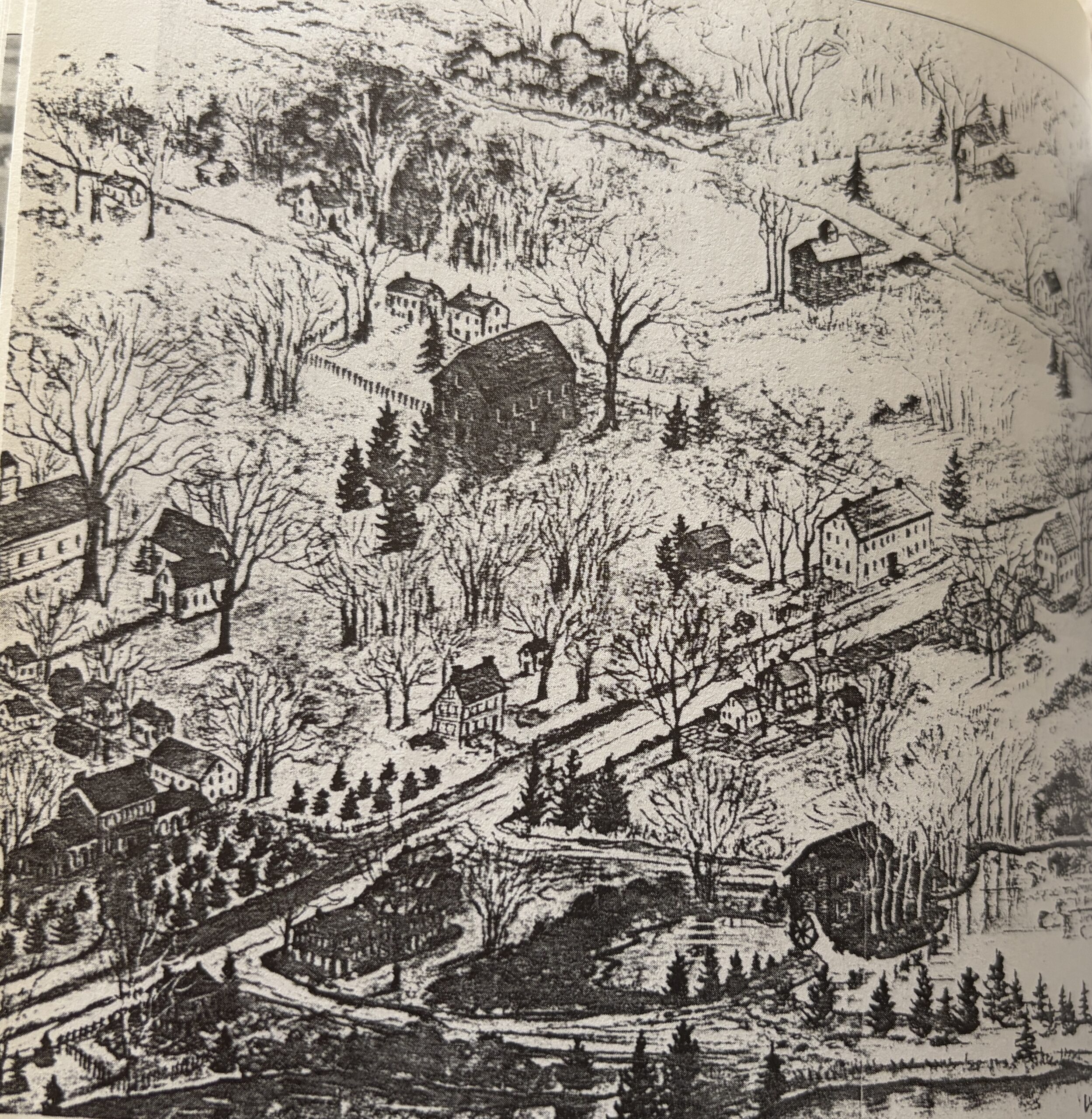 This lithograph, created by Helen Lucia, was created for the Bicentennial celebration of Milford in 1987. The lithograph depicts Milford as it would have looked at the time Parson Sydenham Thorne and Joseph Oliver established the town between 1787 and 1800. This photo appears in Images of America: Milford by Dave Kenton.