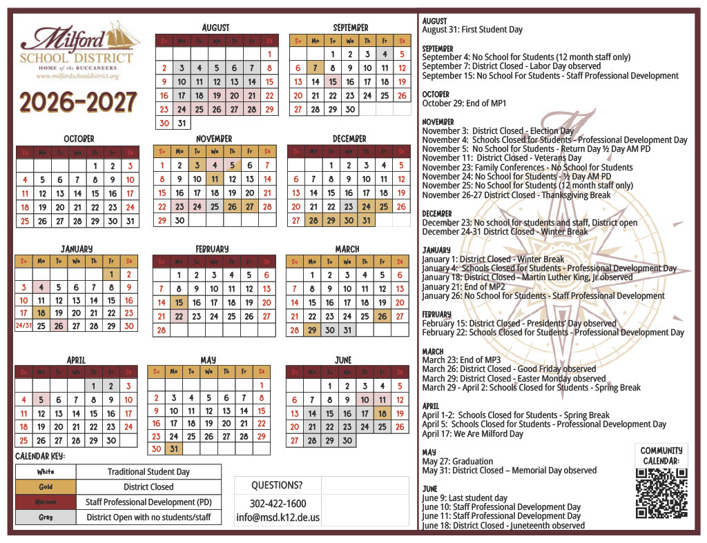 At a recent meeting, Milford School District Board of Education approved the 2026-27 school calendar. The school year will begin August 31 and will end June 9 for students.